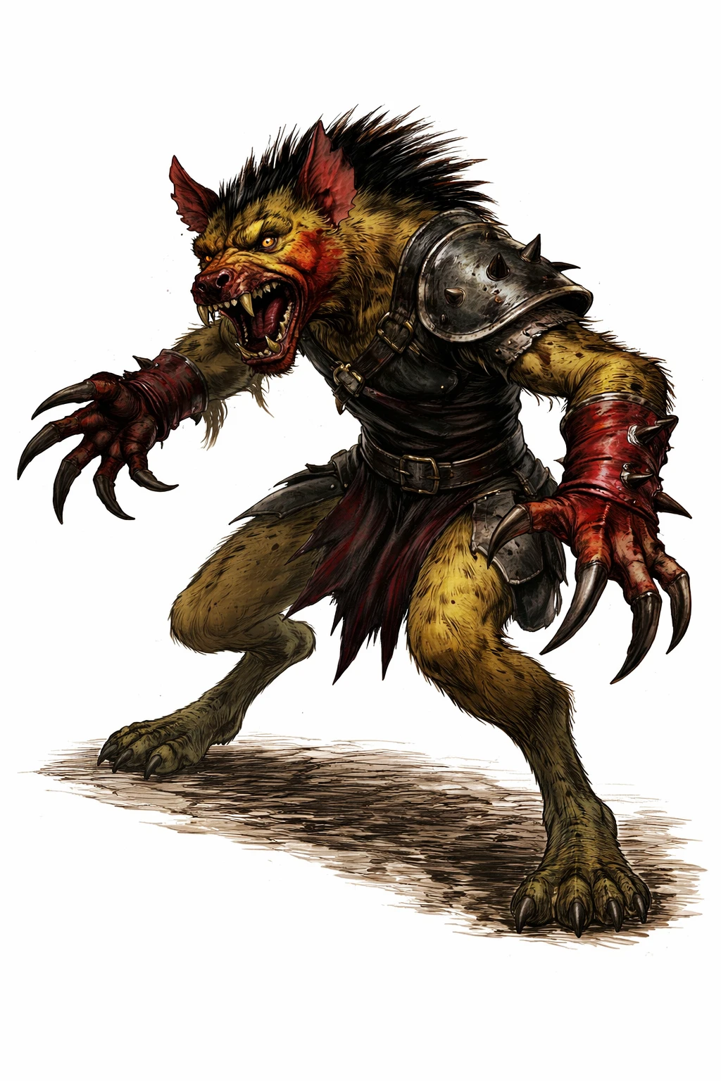 The lowest rank within a gnoll pack, scavengers pick through remains, gather resources, and harass weaker prey. While individually unimpressive, they are rarely encountered alone.