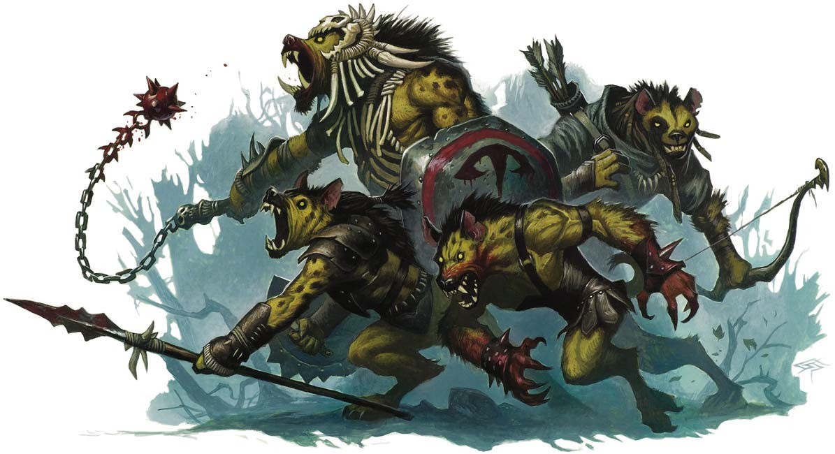 Gnolls are savage, pack-driven hunters known for their brutality and lack of mercy. They rarely build or create, instead taking what they need through force raiding, scavenging, and enslaving those they overpower.