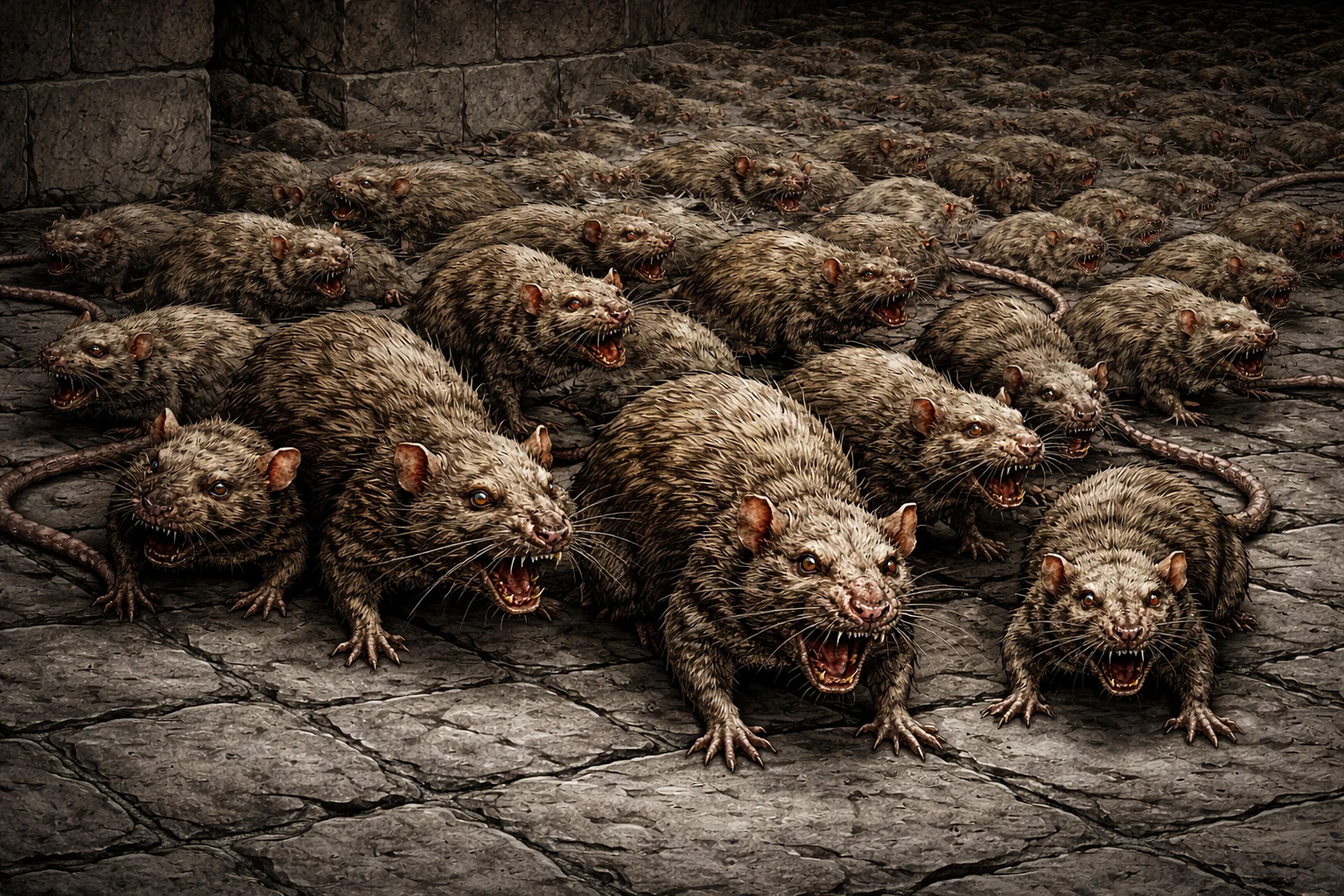 Common in dark, enclosed spaces, rat swarms flood through passages and over obstacles with disturbing speed. They gnaw, bite, and climb over one another in a chaotic surge, making them difficult to contain or repel.