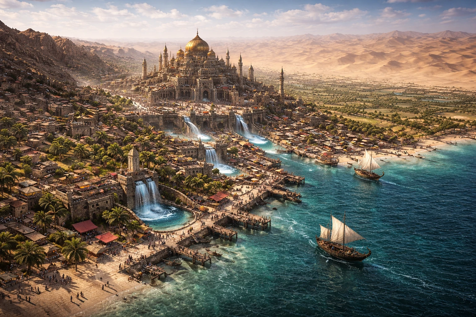 A major city in Zerith, Porin is the shining Jewel of the southern desert. Porin is a port town on the east coast of a massive inhospitable wasteland. Comparatively, it seems an oasis. Magical machines pull the water from the nearby ocean, desalinate it, and provide water to is 200,000 residents, and irrigation for crops and livestock in it’s outlying farms. Beyond the farms, and unforgiving desert of scorching sand awaits any who dare to brave the wild, though there are no other landmarks, nor any passes through the mountain. The city does seem truly cut off from the world.