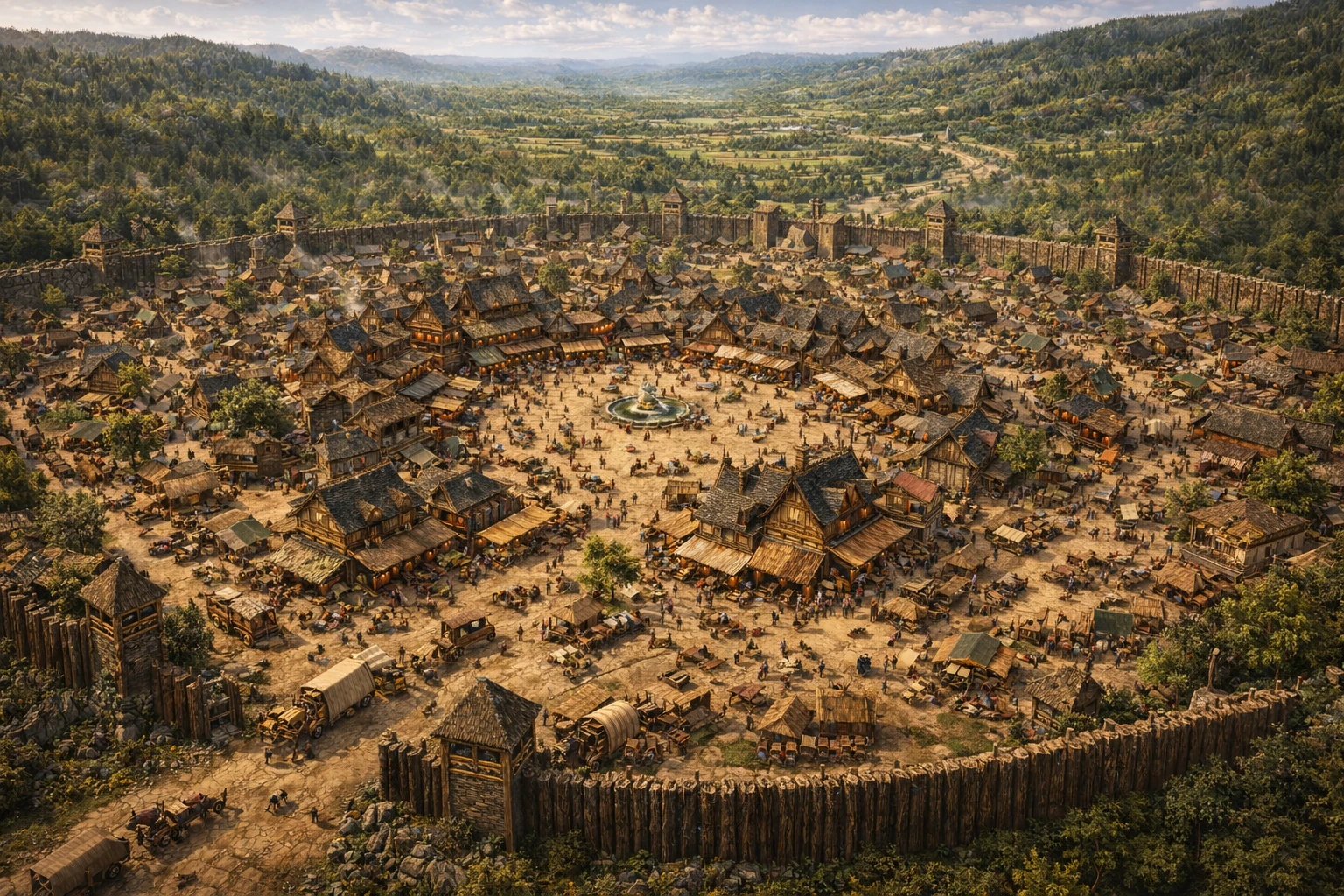 Teralis is far more rustic than other cities, but no less secure. Rather than stone buildings, wooden buildings, log cabins, and other similar aesthetic fill the town. at it’s center, the 9 inns and 12 taverns form the city square. It’s outer wall are made of great logs, reinforced by mortar and stone. The population of the city has just reached 60,000, and while self sufficient for food and fresh water from wells, it also trades with passing caravans non stop.