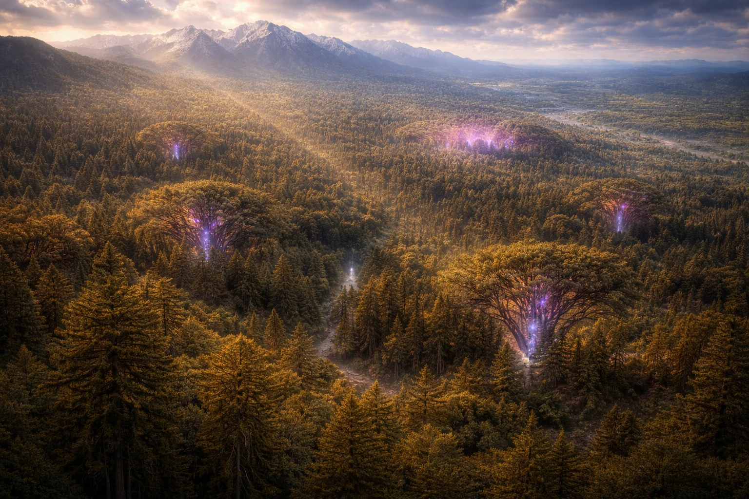 Scattered throughout the Daelen Wood are the rare and luminous Baranonya Trees—massive sequoias marked by faint multihued specks of glowing sap and a subtle prismatic sheen. These trees are unique to the region and are the source of Baranonya Sap, a substance cultivated by the Vael’en and occasionally traded beyond the forest.